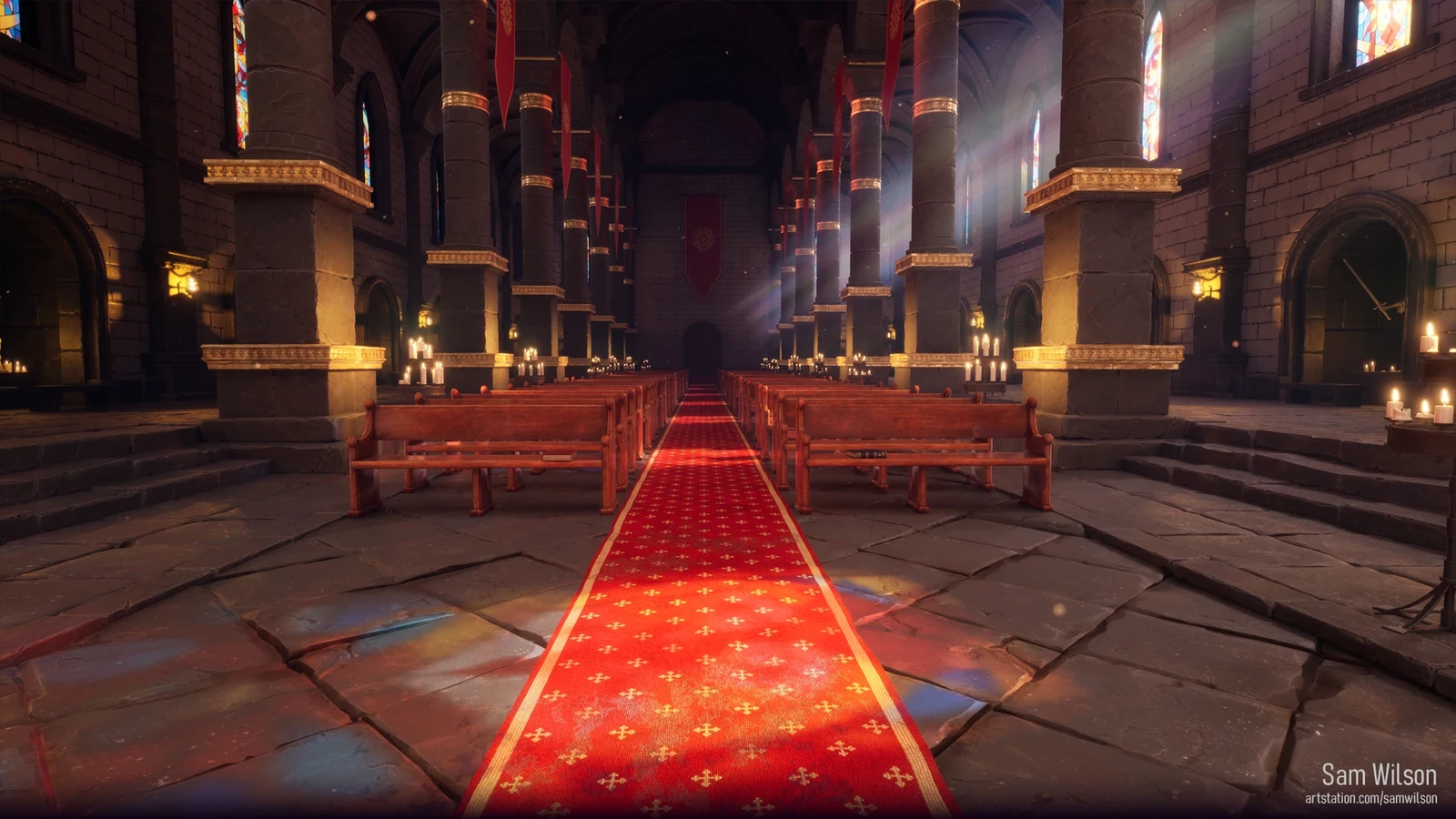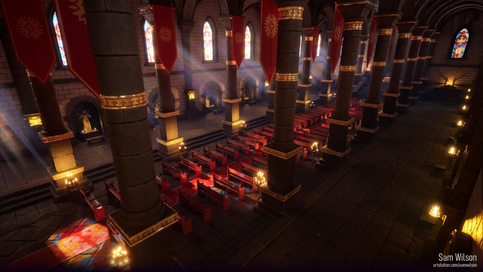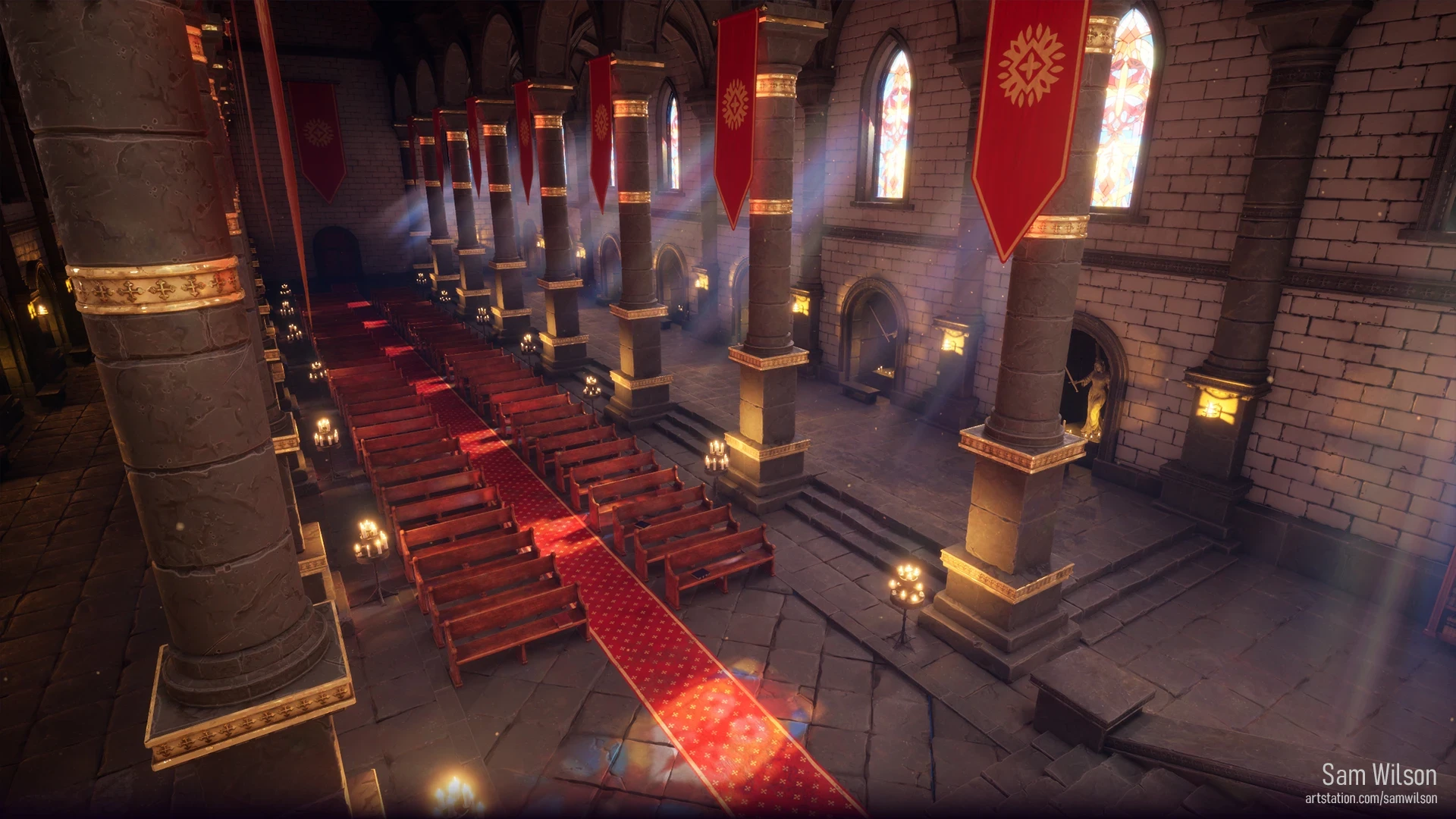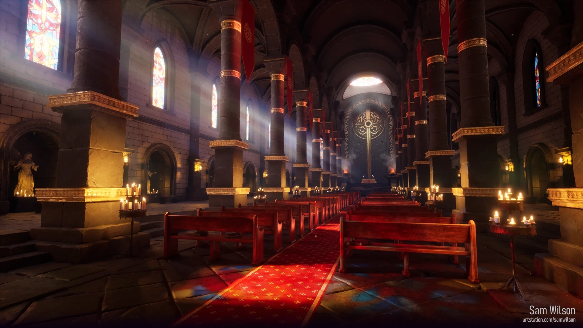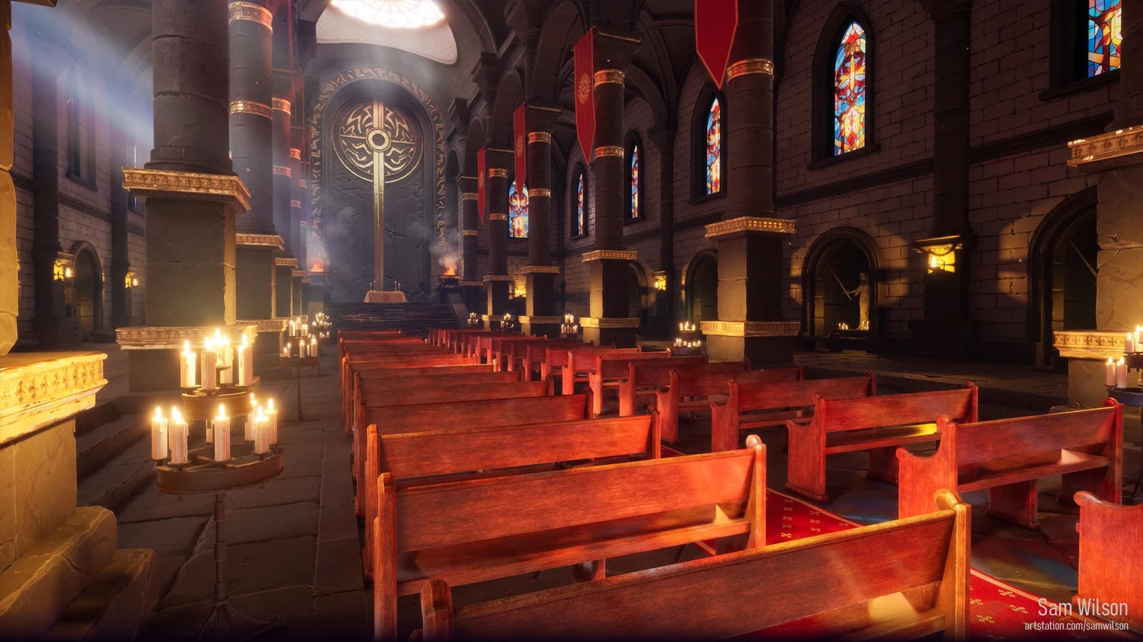I modeled, sculpted when necessary, and textured every asset in this scene. VFX were pulled from Epic's scenes. One of the biggest challenges in this scene was the lighting. Figuring out how to achieve the colorful lighting on the floor from the stained-glass windows required a bit of learning and experimenting.