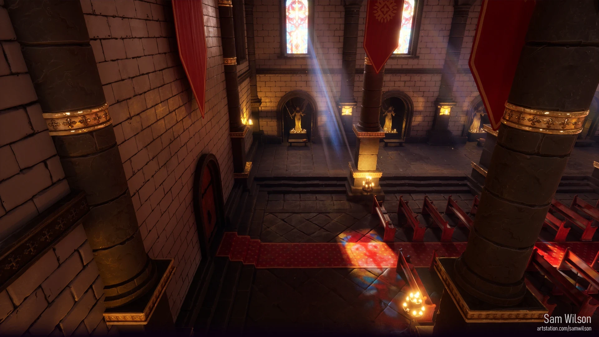 I wanted to convey a sense of an old cathedral that has some mystery around it through an ancient stone door/tomb. The angel statues are there to protect the cathedral, thus the swords. But overall it's an active place of worship. Ruined, run down, but still kept clean and holy.